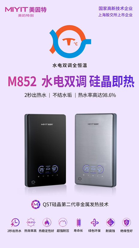 作为水电双调全恒温的旗舰机型,M852从产品核心功能来看,其加热速度、热效率、出水水质、恒温效果等综合指标表现突出,因为不结水垢,水质差的地区也能使用,产品适用范围广。