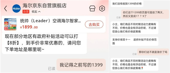 在消费者质问海尔客服时,海尔方面稍稍“抵抗”,之后的回复就很明显敷衍起来了,并且表示,如果在价格上有任何疑问,海尔还提供价保服务,但政府补贴不在价保范围内。