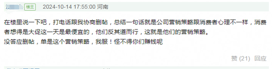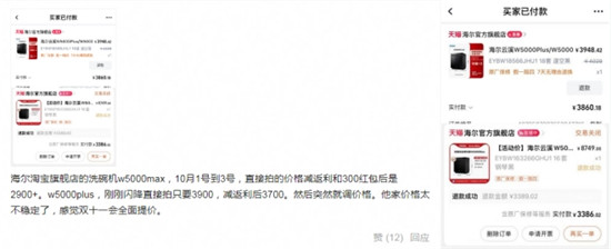 当然,这里并没有否定海尔双11正式开始后,其大促产品的最终价格,可能确实低于消费者12日截图中的1399元,但多年来双11所谓的“最低价”已经被“神化”,在时间跨度被拉到1-2个月的前提下,双11的节点又被模糊。海尔虽然是在两次大促中回复日常促销价,达到为用户制造出更大降价幅度的表象以取悦用户的目的,这行为完全无可厚非,但也可能会让部分消费者产生疑似“被骗”的不悦。