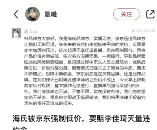 并且重要的是,京东超市采销在直播时公开喊话:“要直接比价李佳琦!在李佳琦直播专享价的基础上再九折!”