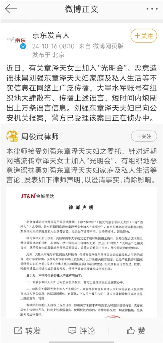 10月16日,京东发言人通过微博发布声明,声明指出:网络上流传有关刘强东、章泽天夫妇加入“光明会”及抹黑其与刘强东家庭及私人生活的不实信息,大量水军账号有组织地散布这些谣言。面对无端的网络攻击和诽谤,章泽天与刘强东选择向公安机关报案,希望通过法律手段查明真相。