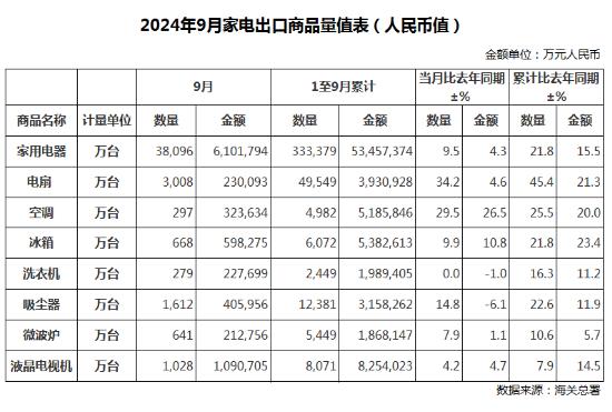 9月出口洗衣机279万台,同比持平;1-9月累计出口2,449万台,同比增长16.3%。