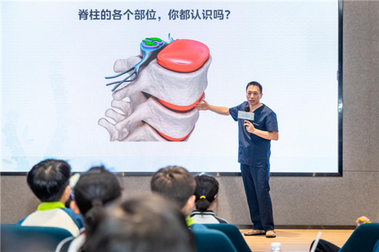 “你们知道吗?脊柱是身体的‘主干道’,帮助我们站立、行走和保持平衡。它保护着我们的脊髓,这是一条连接大脑与全身的‘信息高速公路’。”在活动上,来自和祐医院的骨科主任刘明带领学生们认识脊柱,并讲解了脊柱健康的重要性。