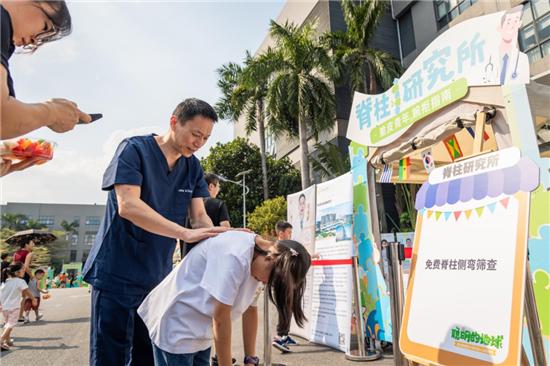 除了互动活动,当天在活动现场设置了脊梁研究所和义卖画展两个特色摊位。在“脊梁研究所”摊位,和祐医院的医生们为孩子们免费筛查脊柱侧弯,并为有需要的儿童青少年赠送全幅DR检查卡。