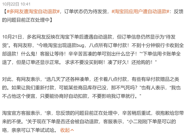 据报道,多位用户在社交媒体上反映,在采用组合支付模式结算购物车商品时,遭遇了系统异常。用户在完成支付后,资金被自动退回至原账户,但订单状态在淘宝平台上却显示为已付款而非退款成功,且用户未收到任何退款通知。这一状况导致用户在资金退回的同时,商品仍然被正常发货,引发了一系列混淆。