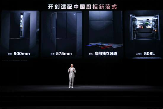 冰箱容量方面,冰箱整机达到超薄575mm的厚度,在900mm宽度下,但最终实现单台508L超大容积,可满足五口之家的整月所需,下抽屉甚至可化身超大冷柜,足以放下整只羊腿。