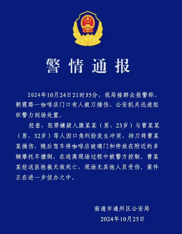 经查,犯罪嫌疑人康某某(男,23岁)与曹某某(男,32岁)等人因口角纠纷发生冲突,持刀将曹某某捅伤,随后驾车将咖啡店玻璃门和停放在附近的多辆摩托车撞倒,在逃离现场过程中被警方控制。曹某某经送医抢救无效死亡,现场无其他人员受伤。案件正在进一步侦办之中。