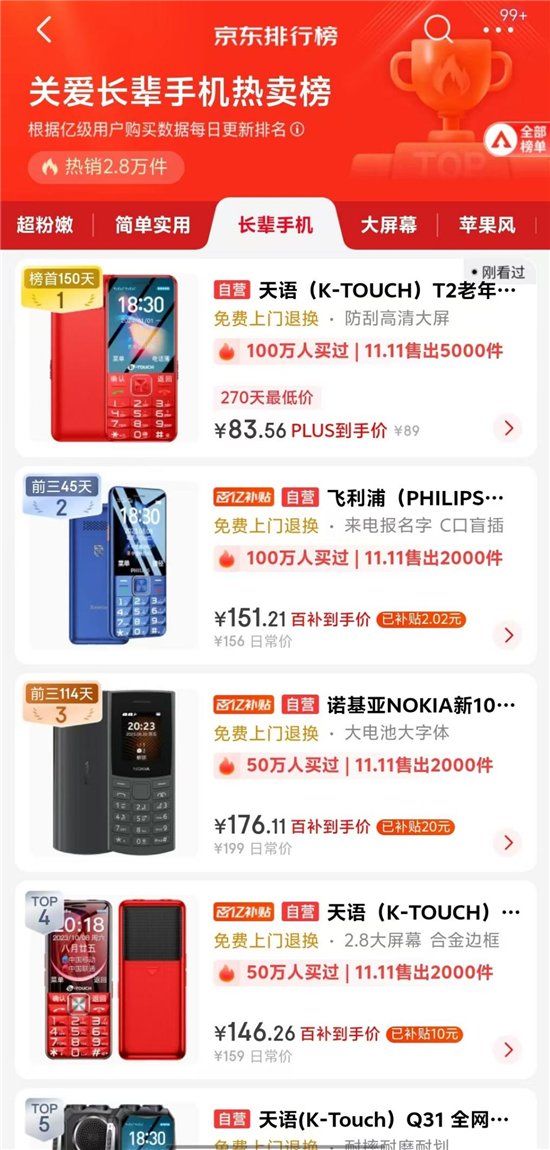 回到京东关爱长辈手机热卖榜,我们可以看到,排名第一的天语T2老年人手机销售量已经超过100万台,第二名飞利浦和第三名诺基亚也分别达到了50万和20万,足见,老年机虽然是细分需求,但实际的市场空间并不小。