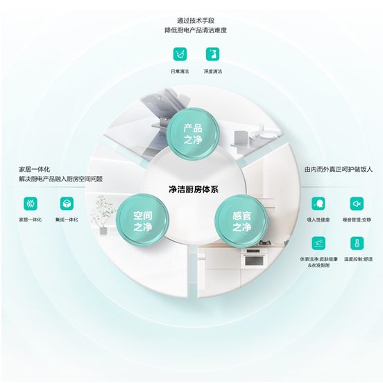 华帝“净洁厨房”让厨房升级有了更治愈、更好清洁的选择,它涵盖了产品之净、空间之净、感官之净三大维度。聚焦“好清洁”战略,“净洁厨房”从日常清洁、深度清洁两方面由内到外提升产品清洁力,产品上通过“超薄”“一体化”“集成”等形态简化,打造整洁、清爽的视觉效果;体验上聚焦用户的感官体验,改善厨房空气质量、降低噪音及温度,让消费者得到更舒适的体验,打造清洁、健康和安静的厨房环境。