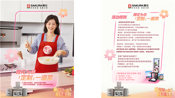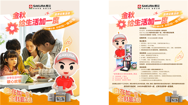 清新加一度、味蕾加一度、自在加一度……SAKURA樱花金秋季全国巡展线上线下惊喜连连,关注官方微信公众号、微博、小红书、抖音号,参与#金秋给生活加一度#与#你最爱的一道菜#话题互动,分享与SAKURA樱花加一度的故事和最爱吃的一道菜,有机会赢取樱花生活电器、「金秋趣生活轻松去班味」周边等精彩好礼。