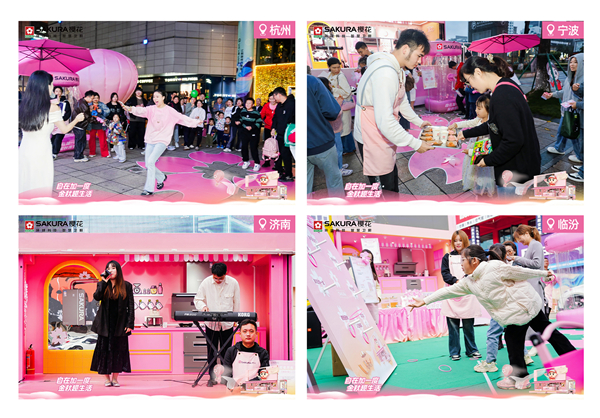 樱你而来,生活处处是风景,SAKURA樱花将在杭州、宁波、济南、临汾、苏州、上海、郑州、南阳等全国16座城市打造自在生活城市站,营造城市街头的闲趣空间。来自各大社交媒体平台的热榜达人倾情助阵,带来精彩纷呈的才艺表演和直播现场,增添别样的魅力与趣味。可以在喧嚣中停下脚步,品尝精心准备的樱花味道,在热气球旁打卡,挑战樱花缤纷的喜悦,套出有求必樱的祝福,收获趣味樱花印章,兑换定制周边,体验这个季节独有的幸运与欢乐。