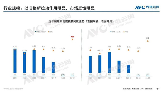 随着消费品以旧换新政策的深化推进,各地家电零售渠道迎来前所未有的繁荣景象,国补政策在消费群体中的认知度不断扩大,更多的换新需求和县域下沉需求不断涌现。奥维云网(AVC)数据显示,2024年1-9月我国油烟机市场累计零售额为231亿元,同比增长4.5%;灶具市场累计零售额为131亿元,同比增长6.3%,其中政策促进作用明显。