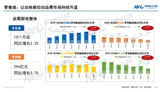 伴随国家以旧换新政策的持续推进,消洗嵌净四大品需品类进入了多地的以旧换新名单,2024年Q3厨卫品需品类(洗碗机、消毒柜、嵌入式微蒸烤、净水器)市场呈现明显的上行态势。奥维云网(AVC)推总数据显示,品需厨电前三季度累计零售额为296亿元,同比增长3.7%;从换新效果看,9月四大品需品类同比增速均超过15%,其中洗碗机和净水器市场同比增速超过25%,涨势强劲。