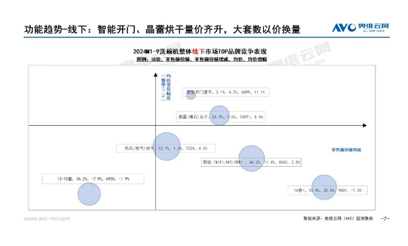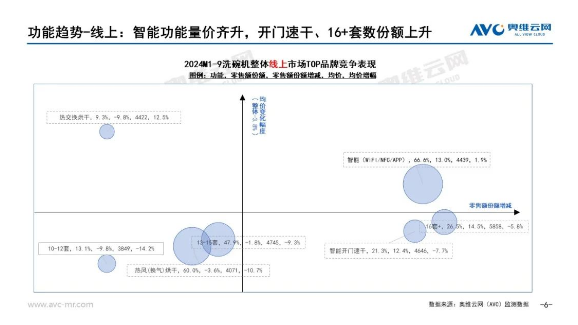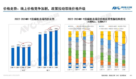 从价格上看,虽然今年线上市场整体出现一定的价格降级趋势,但是以旧换新政策对9月市场的价格结构拉动明显。奥维云网(AVC)监测数据显示,2024年9月,洗碗机线上市场6000元以上价格段零售额占比为25.7%,较今年1-9月整体增长2.8个百分点;洗碗机线下市场10000元以上价格段零售额占比为34.0%,较今年1-9月整体增长4.1个百分点。以旧换新政策的实施拉动双线市场的价格升级。