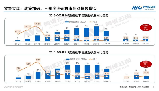 随着消费者对于品质生活追求的不断升级,洗碗机逐渐受到中国家庭的喜爱。但当前,房地产市场调整、居民消费意愿变化等因素制约了国内洗碗机市场的快速增长。以旧换新政策中,洗碗机入围了不少地方的补贴名单,“以旧换新”政策成为了推动市场复苏的重要力量。奥维云网(AVC)推总数据显示,2024年1月-9月洗碗机市场零售额规模80亿元,同比增长6.5%;零售量规模139万台,同比增长6.2%。其中9月,洗碗机市场零售额规模11亿元,同比增长26.9%;零售量规模17万台,同比增长29.1%。