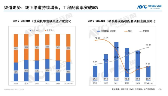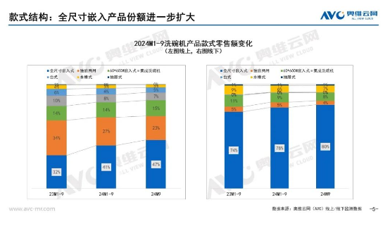 款式结构上看,全尺寸嵌入式仍是企业主推类型,份额持续扩张。奥维云网(AVC)监测数据显示,2024年1-9月,全尺寸嵌入式洗碗机线上、线下市场份额分别为41%、78%,同比分别增长6和4个百分点。9月政策实施后,全尺寸嵌入式市场份额进一步实现扩张,双线市场份额分别达到47%和80%。