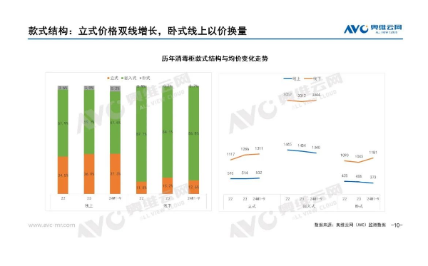 从款式结构看,嵌入式仍是主力款式,但长期看立式消毒柜的份额正逐渐扩张,奥维云网(AVC)监测数据显示,2024年1-9月立式消毒柜线上、线下零售额份额分别为37.3%、12.6%,价格也在稳步提升。卧式消毒柜线上也出现明显增长,主要原因是产品逐渐小型化面向小户型人群,以及主打母婴人群的专业小型产品拉动。