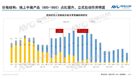 从价格结构看,线上消毒柜中端产品增长明显,奥维云网(AVC)监测数据显示,2024年1-9月我国线上消毒柜800-1800价位段产品零售额份额为45%,较2023年全年提升3个百分点。增长一方面来自于立式产品升级带来的结构增量,另一方面来自于线上嵌入式产品的价格下探。
