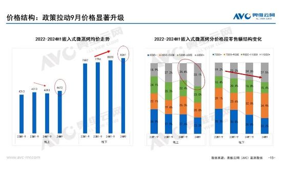 从价格结构看,以旧换新政策对9月市场的价格结构拉动明显,均价整体呈上涨趋势,结构上行。奥维云网(AVC)监测数据显示,2024年9月,嵌入式微蒸烤线上市场6000元以上价格段零售额占比为33.1%,较去年增长5.9个百分点;嵌入式微蒸烤线下市场11000元以上价格段零售额占比为27.5%,较去年增长5.3个百分点。