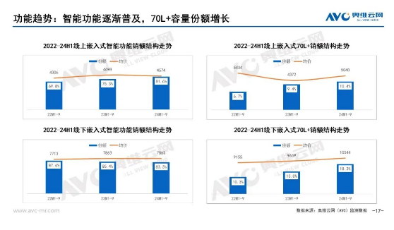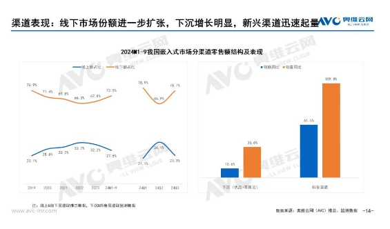 从渠道看,三季度以旧换新拉动嵌入式线下市场份额持续增长。奥维云网(AVC)监测数据显示,2024年1-9月,嵌入式产品线下零售额占比为72.5%,较去年整体上涨4.7个百分点。同时,下沉渠道和抖音渠道的销售也有明显的上行趋势。奥维云网(AVC)监测数据显示,2024年1-9月,嵌入式产品下沉和抖音渠道零售额同比增速分别为10.6%、61.5%,市场依然广阔。