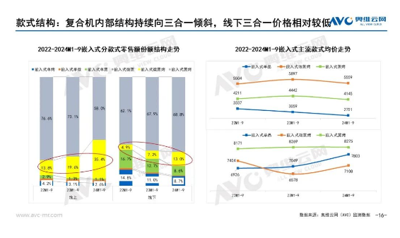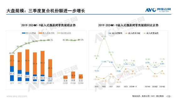 随着用户对于微、蒸、烤复合功能需求的持续提升,嵌入式复合机产品在市场的份额也持续走高。奥维云网(AVC)推总数据显示,2024年1-9月,嵌入式复合机产品零售额占比为80.3%,较去年整体上涨1个百分点。