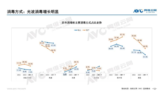 从消毒方式看,传统的高温、紫外线消毒仍是主要消毒方式。除此之外,光波消毒方式增长明显,臭氧消毒方式双线出现下滑。奥维云网(AVC)监测数据显示,2024年1-9月我国线上线下光波消毒方式产品零售额占比分别提高6.0个百分点和9.9个百分点。臭氧消毒方式产品零售额占比线上线下分别下滑9.5个百分点和13.5个百分点。