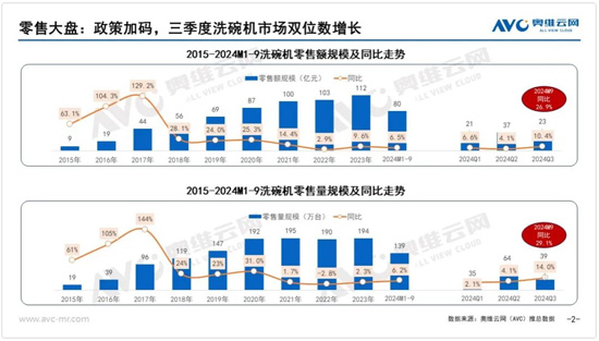 随着消费者对于品质生活追求的不断升级,洗碗机逐渐受到中国家庭的喜爱。但当前,房地产市场调整、居民消费意愿变化等因素制约了国内洗碗机市场的快速增长。以旧换新政策中,洗碗机入围了不少地方的补贴名单,“以旧换新”政策成为了推动市场复苏的重要力量。奥维云网(AVC)推总数据显示,2024年1月-9月洗碗机市场零售额规模80亿元,同比增长6.5%;零售量规模139万台,同比增长6.2%。其中9月,洗碗机市场零售额规模11亿元,同比增长26.9%;零售量规模17万台,同比增长29.1%。