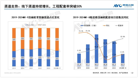 款式结构上看,全尺寸嵌入式仍是企业主推类型,份额持续扩张。奥维云网(AVC)监测数据显示,2024年1-9月,全尺寸嵌入式洗碗机线上、线下市场份额分别为41%、78%,同比分别增长6和4个百分点。9月政策实施后,全尺寸嵌入式市场份额进一步实现扩张,双线市场份额分别达到47%和80%。
