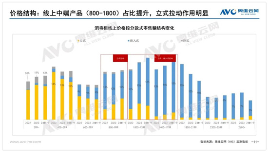 从价格结构看,线上消毒柜中端产品增长明显,奥维云网(AVC)监测数据显示,2024年1-9月我国线上消毒柜800-1800价位段产品零售额份额为45%,较2023年全年提升3个百分点。增长一方面来自于立式产品升级带来的结构增量,另一方面来自于线上嵌入式产品的价格下探。
