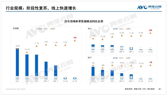 局部地区依旧换新政策品类增加涉及到消毒柜,对销售拉动作用明显,奥维云网(AVC)监测数据显示,2024年9月我国线上消毒柜零售额同比增长33%。