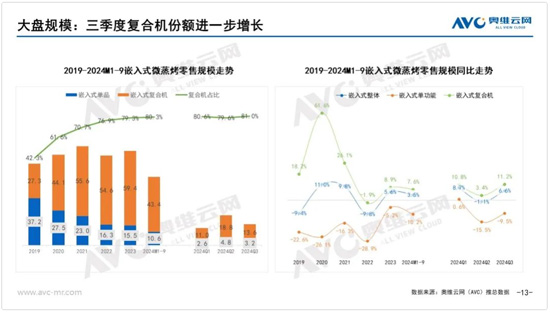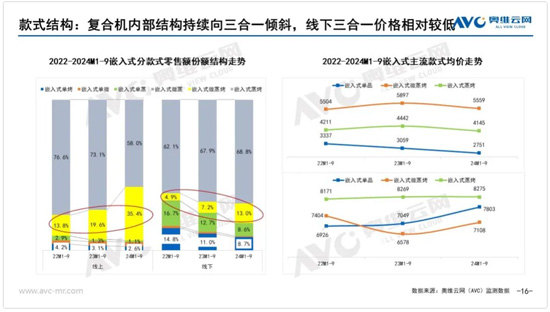 随着用户对于微、蒸、烤复合功能需求的持续提升,嵌入式复合机产品在市场的份额也持续走高。奥维云网(AVC)推总数据显示,2024年1-9月,嵌入式复合机产品零售额占比为80.3%,较去年整体上涨1个百分点。