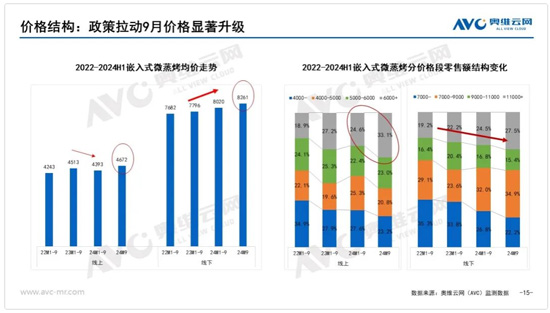 从价格结构看,以旧换新政策对9月市场的价格结构拉动明显,均价整体呈上涨趋势,结构上行。奥维云网(AVC)监测数据显示,2024年9月,嵌入式微蒸烤线上市场6000元以上价格段零售额占比为33.1%,较去年增长5.9个百分点;嵌入式微蒸烤线下市场11000元以上价格段零售额占比为27.5%,较去年增长5.3个百分点。