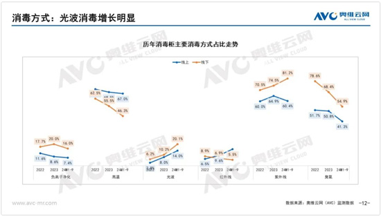 从消毒方式看,传统的高温、紫外线消毒仍是主要消毒方式。除此之外,光波消毒方式增长明显,臭氧消毒方式双线出现下滑。奥维云网(AVC)监测数据显示,2024年1-9月我国线上线下光波消毒方式产品零售额占比分别提高6.0个百分点和9.9个百分点。臭氧消毒方式产品零售额占比线上线下分别下滑9.5个百分点和13.5个百分点。