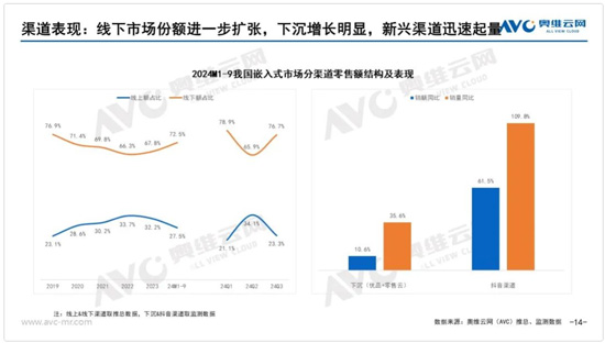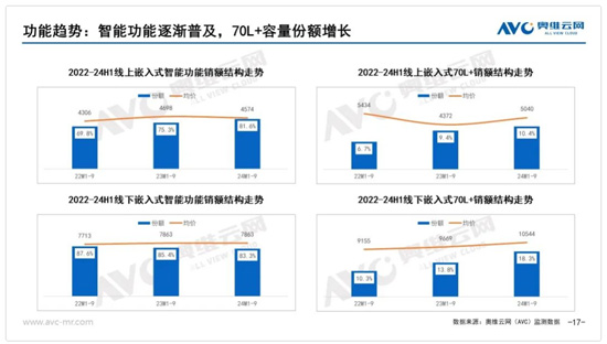 从渠道看,三季度以旧换新拉动嵌入式线下市场份额持续增长。奥维云网(AVC)监测数据显示,2024年1-9月,嵌入式产品线下零售额占比为72.5%,较去年整体上涨4.7个百分点。同时,下沉渠道和抖音渠道的销售也有明显的上行趋势。奥维云网(AVC)监测数据显示,2024年1-9月,嵌入式产品下沉和抖音渠道零售额同比增速分别为10.6%、61.5%,市场依然广阔。