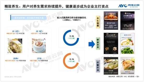 此外,由于用户对养生需求的持续升温,各品牌针对健康这一主题纷纷提出自己的解决方案。奥维云网(AVC)监测数据显示,空炸功能产品双线零售额占比均有超过10个百分点的增长。同时市场针对养生慢煨、健康蒸煮、控糖控油也分别推出了自己的差异化卖点。