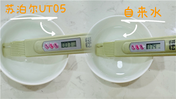 对于消费者而言,使用TDS测水笔是检测水质的一种简便方法。TDS值反映溶解性固体总量,值越低表示水中杂质越少,水质更健康。经过测试显示,苏泊尔的TDS值为7,自来水(测试自来水水源为长江水)TDS值为174,从TDS角度看,台式净饮机UT05所制纯水完全符合直饮标准。