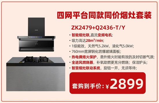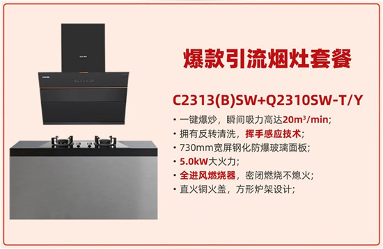 为契合京东下沉渠道,樱雪特推出极致性价比的两款烟灶套餐,包括京东电商、抖音直播、京东下沉渠道、线下传统渠道四平台同款同价销售——2899元智能变频烟灶套餐(28m³/min风量,1200pa风压直流变频烟机ZK2479搭配64%热效率、5.2kW火力、全进风设计,双边定时灶具Q2436-T/Y);以及爆款引流烟灶套餐(20m³/min吸力和挥手智控吸油烟机C2313(B)SW搭配5.0kW火力灶具Q2310SW-T/Y)。