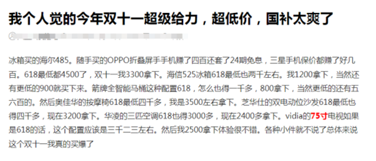 而这,主要还是得益于国家的家电补贴政策,与双11平台活动和品牌企业的让利促销活动的叠加,为刚需消费者创造出了巨大的省钱空间。