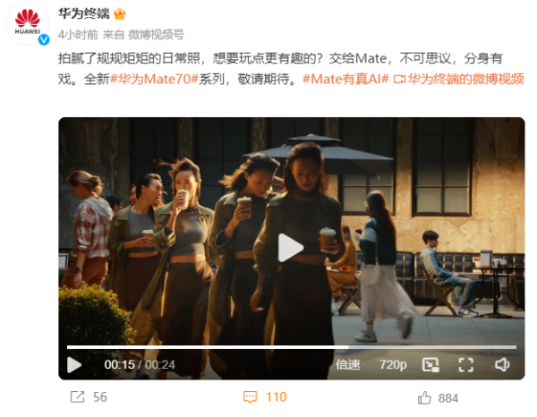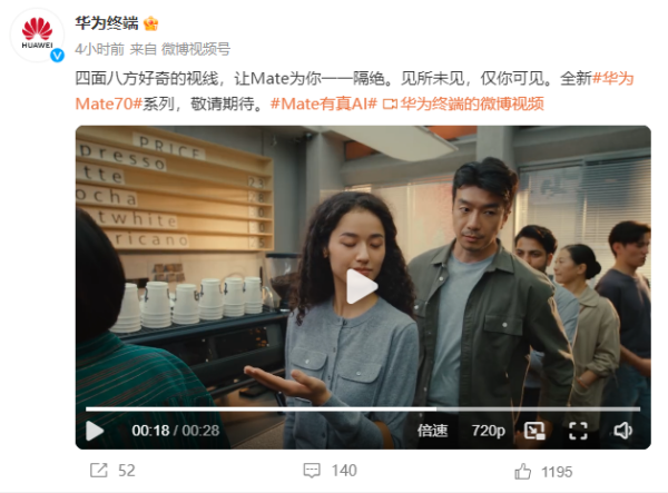 第一条以“一抓一放、掌控全场”为主题。视频中主角在烹饪的时候通过一抓一放瞬间移动了小猫,整理了衣柜和餐桌,这条视频主要讲述的是“AI手势”。众所周知,隔空操控一直是华为手机的一个卖点,当不方便接触手机操作的时候,就可以使用隔空手势翻阅网页,操作音乐播放器等等。此条视频大概率想透露的就是Mate70+AI将带来手势操控新玩法。