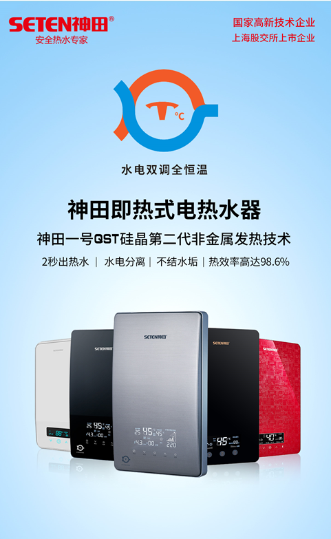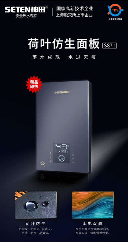 2024年,神田推出水电双调全恒温新品S871.采用了荷叶仿生技术+水电双调技术的产品平台,也开创了行业内荷叶仿生技术的先河。荷叶仿生玻璃面板,防指纹,防眩光,防刮花,防油,防水,易清洁,与普通的钢化玻璃面板相比,落水成珠,水过无痕,不挂水,质感更强,让即热式产品档次更上一层楼。