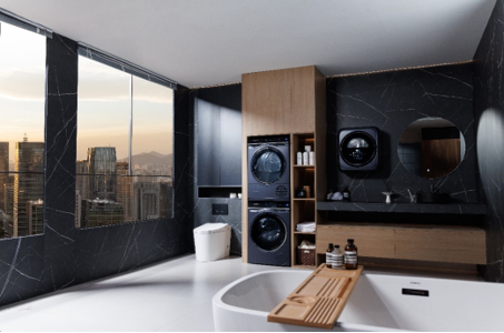 西门子壁挂式滚筒迷你洗衣机除了拥有强大的洗涤功能以外,更以高颜值的经典设计满足不同的装修场景的需求。其湖蕴蓝机身有着岩石般的高级磨砂质感,可以与西门子湖蕴蓝洗干套装搭配。432mm大门圈设计既提升了操作便利性,也为家居风格增添了优雅质感。