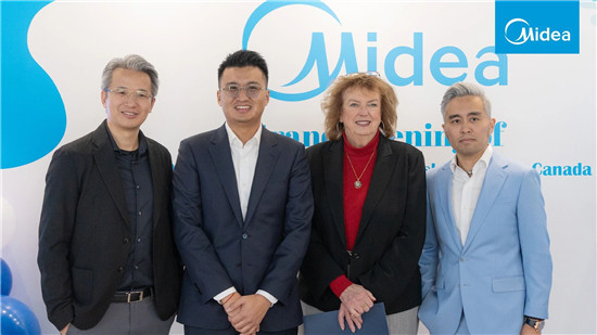 嘉宾合照从左至右为北美区域负责人黄畅飞,美的空调加拿大代理Ascend Group首席运营官Felix Zou,密西沙加市长Carolyn Parrish,Ascend Group产品经理Totti Wu
