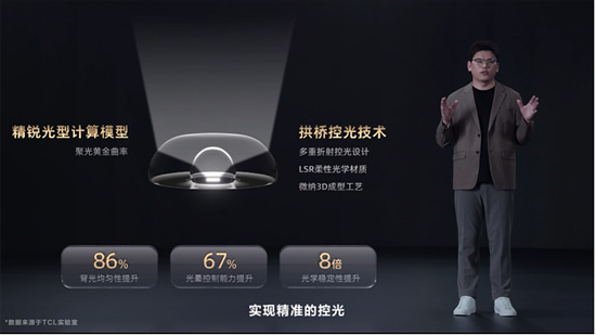 发光芯片的升级,是造就万象分区的第一个环节。TCL将蓝宝石高光晶底升级为超能高光晶底,并以ALD原子级耐蚀工艺实现电视亮度与能效的大幅提升,相较上一代多芯Mini LED芯片亮度提升53.8%,能效提升10%。第二,TCL使用升级版的拱桥控光技术,并采用可靠性更强的LSR柔性光学材质,同时还通过独家精锐光型计算模型,使新一代聚光微透镜在同样的分区数下,带来86%的背光均匀性提升与67%的光晕控制能力提升,更好地塑光型、去光晕,实现精准控光。