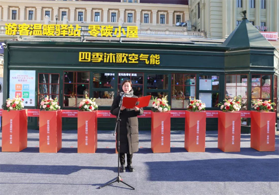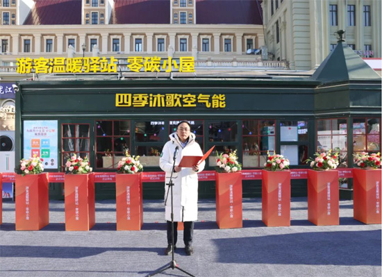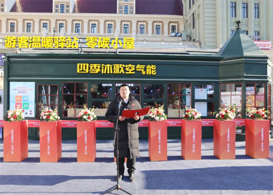 四季沐歌集团总裁李骏在仪式讲话中指出,此次将温暖驿站升级为温暖驿站零碳小屋,一是希望全方位发挥窗口示范作用,以热情周到的服务为每一位游客驱散寒意、送上暖意;二是为踊跃投身公益的青年志愿者搭建平台,公益之心在此汇聚;三是将其作为广大青少年探索环保知识、践行低碳理念的科普实践基地,将哈尔滨整座城市坚持绿色低碳发展的理念传至五湖四海。