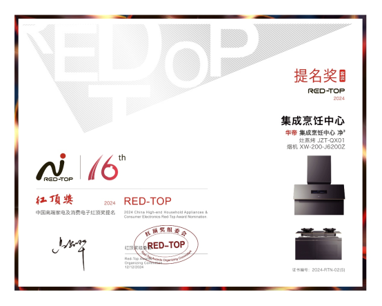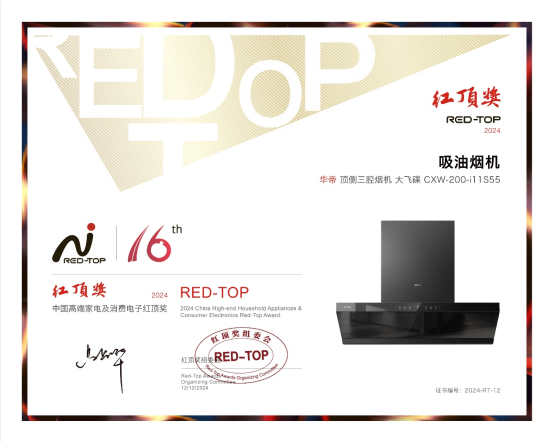 本届红顶奖获奖产品是各细分赛道的“创新标兵”。吸油烟机的获奖产品由“厨电三杰”的华帝摘得,获奖产品型号为“顶侧三腔烟机大飞碟CXW-200-i11S55”。此外,华帝集成烹饪中心“净³”(灶蒸烤JZT-QX0+烟机XW-200-J6200Z)获得集成烹饪中心品类提名奖。
