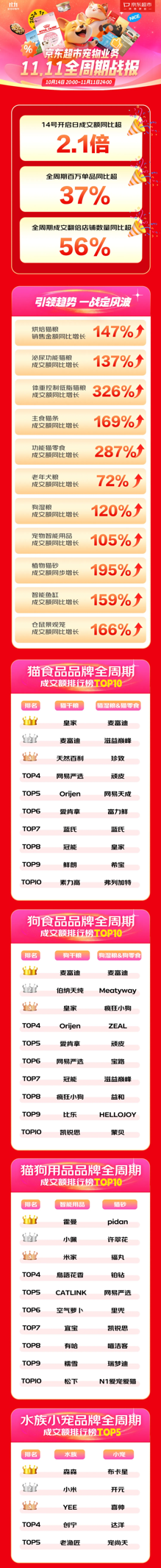 在消费市场上,宠物行业展现出惊人的增长潜力和抗风险能力。近年来,宠物赛道在消费大战中异军突起,成为增长最为迅猛的领域之一。在刚刚过去的双十一购物节中,宠物商品销量再创新高。据京东超市宠物业务发布的双十一战报显示,百万单品同比增长超37%,成交翻倍店铺数量同比增长超56%,双十一开启日宠物业务成交额同比增长更是超过2.1倍。同时,科技的进步也推动了智能养宠设备的普及。据蝉妈妈数据显示,2024年双十一期间,宠物智能窝、智能除味器、智能碗以及智能猫砂盆等产品的成交量均实现大幅增长。