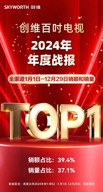 据奥维云网2024年W1-W52(1月1日-12月29日)数据显示,创维百吋电视全渠道销额占比39.4%,销量占比37.1%,稳居全国第一;其中100Q7D荣登百吋电视2万元档TOP1.这一成就不仅彰显了创维在大屏电视市场的强大竞争力,更体现了其在技术实力和产品线布局上的深厚积累。