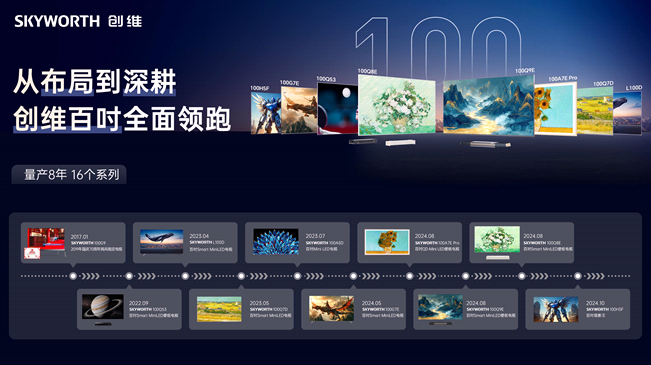 从初步布局到深度耕耘,创维在百吋电视领域已经量产长达八年,期间推出了多达16个系列的产品,涵盖了从高端定制到性价比优选的各种需求,满足了不同消费者的多样化选择。2017年创维推出第一代创维百吋电视100G9产品,为消费者提供极致观影体验,并凭借强大的产品实力荣幸成为新中国成立70周年大会、阅兵式的唯一指定电视。