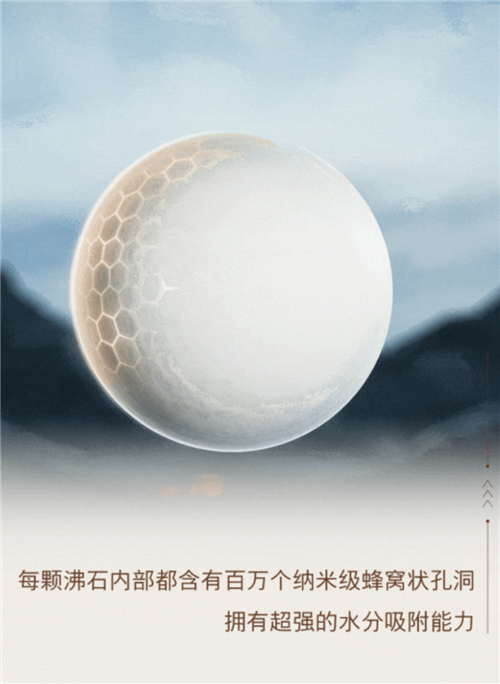 沸石是一种天然矿石,由亿万年前火山喷发出的岩浆沉积后形成,由自然孕育而生,蕴藏着自然灵气。每颗沸石内部都含有百万个纳米级蜂窝状孔洞,拥有超强的水分子吸附能力。水分子被吸附进其孔洞结构后,会将动能转化为热能,释放出高温。因独特的结构,沸石具有优异的吸湿放热性能,能够在烘干过程中持续吸收水分,并通过热交换原理将其排出,被称为“会呼吸的奢侈品”。除此之外,沸石吸湿放热的天然特性可释放干燥热风,每次除湿结束后沸石都能恢复干燥,从内而外无一丝水汽,这使其成为了高效烘干、且节能环保的理想除湿材料。