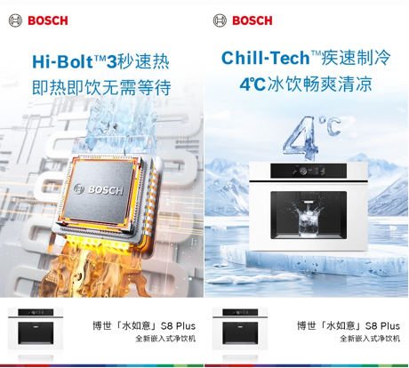 博世「水如意」S8 Plus嵌饮机搭载即热式Hi-Bolt™速热模块加热技术,3秒内即可将水温加热至所需温度,并且预设7种热水程序,可支持10个自定义程序,随时畅享温暖。同时,产品搭载全新Chill-Tech™冰水技术,通过高效压缩机制冷,冰水温度低至4℃3,单次出冰水量可达1.5L,搭配3档冰水温度(4°C,6°C,10°C)自由选择,疾速制冷,随时享受冰爽口感。无论是热饮还是冷饮,都能轻松满足,为消费者呈现理想温度与口感。